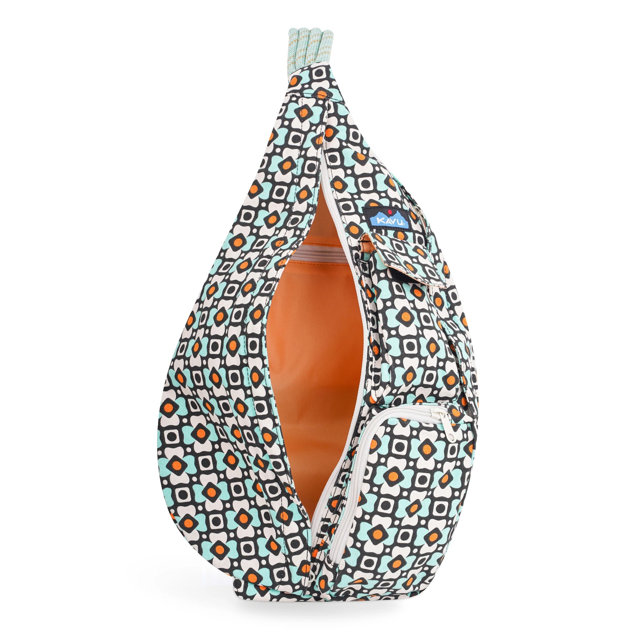 This cotton canvas sling features an adjustable rope shoulder strap with side release buckle, two vertical zip compartments, two key or cell phone pockets, and a padded back with KAVU embroidery.