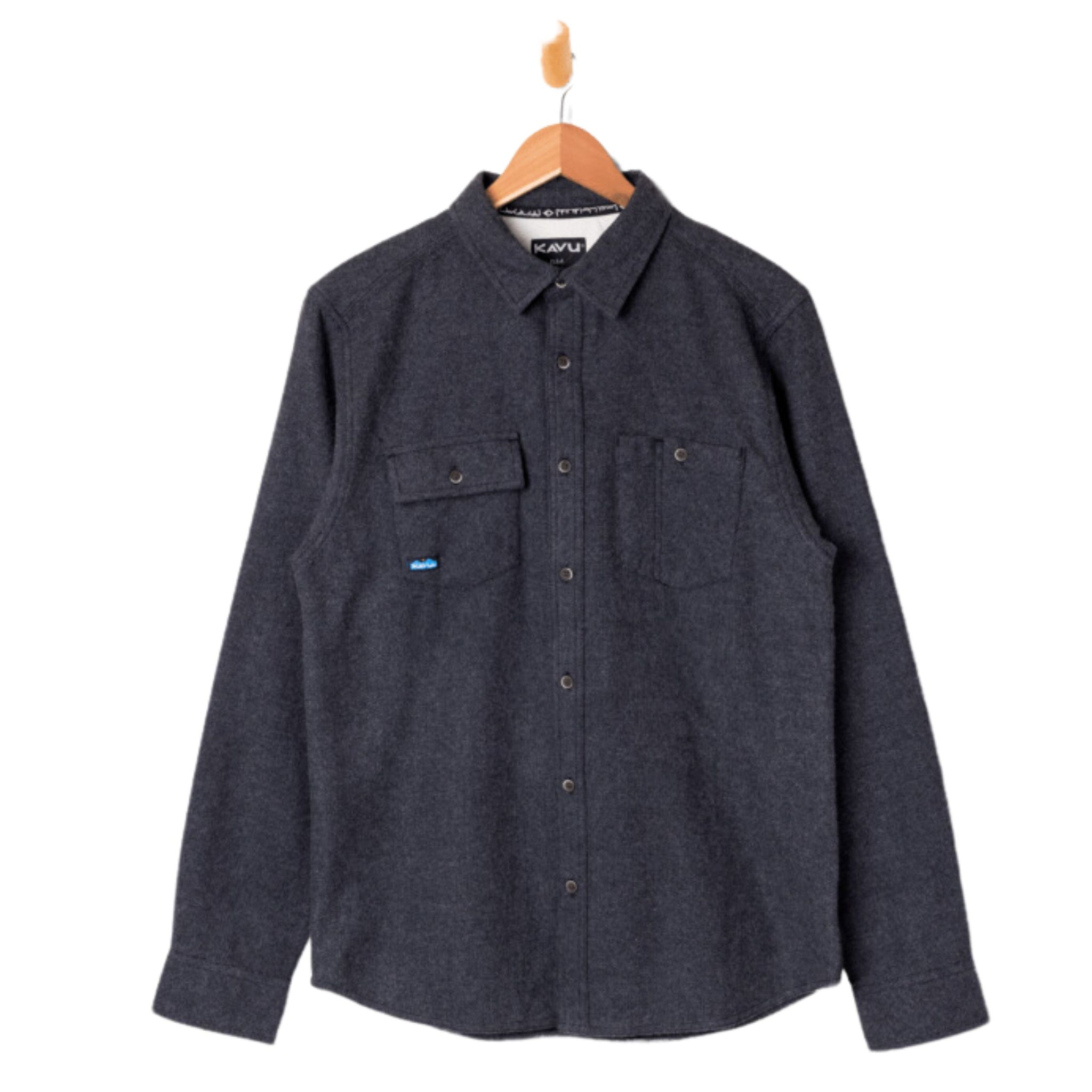 • Casual fit, long sleeve button up shirt, stand collar with interior KAVU logo jacquard tape, two chest pockets with button closure (one with flap, one top entry with pen pocket), piecing at back armholes, natural twill lined adjustable cuffs and back bias cut yoke with center back box pleat, 25% certified recycled polyester faux wood buttons, curved hem